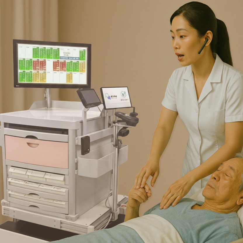 Nurses can call the nursing cart via voice commands, which automatically follows staff movement, enabling remote召唤 and real-time support while freeing hands for patient care